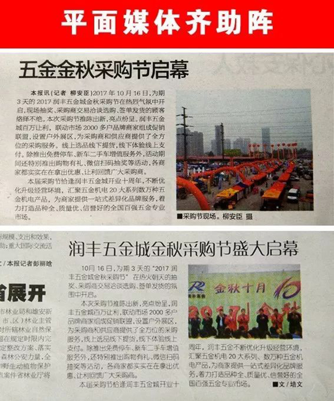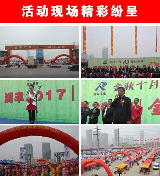 润丰五金2017金秋采购节自10月16日盛大开幕,历时3天,于18日圆满结束。这是我市场连续举办的第三届秋季采购节,在延续前两届让利促销、购物有礼、集赞有奖等模式的基础上,本次增加广宣推广和促销礼品投入力度,免收采购节期间停车费,针对市区专业市场、工矿企业、建筑施工单位派发邀请函,并组织人员前往周边城市邀请采购商、分销商前来参展,增设户外促销展区,邀请150家生产厂家带来优质货源,并为采购节制定专项促销政策,在采购节现场与广大采购商对接洽谈。