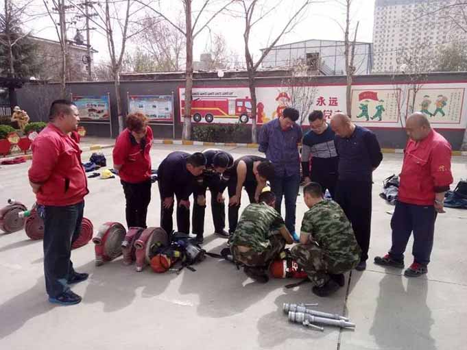 消防安全部为提高消防训练水平,联系汇通路消防中队,为我们组织专项培训,本次培训以扎实基本消防技能为主,学习使用空气呼吸机,并根据市场实际特点,由消防队教官为我们讲解火场警戒、消防车分组展开等实战注意事项。